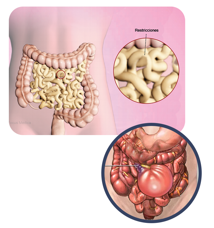 Una obstrucción intestinal ocurre cuando la comida o las heces no pueden salir del intestino. La obstrucción puede ser completa o parcial. Hay muchas causas. Las más comunes son adherencias, hernias, tumores y algunas medicinas. Los síntomas incluyen: ► Dolor abdominal severo. ► Vómitos. ► Inflamación. ► Distensión abdominal. ► Incapacidad para eliminar gases. ► Estreñimiento. Una obstrucción intestinal completa es una emergencia médica. Es necesario iniciar con el manejo médico el cual consiste en hidratación por la vena, medicamentos analgésicos, ayuno y la colocación de una sonda a través de la nariz la cual llega al estómago y nos ayuda a descomprimirlo. En general, el 20% de los pacientes llegan a necesitar cirugía.